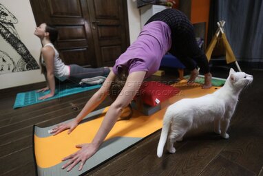 Занятия йогой в антикафе с кошками в центре Москвы.