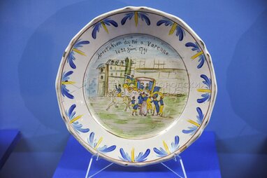 «Тарелка со сценой ареста короля Людовика XVI в Варенне 22 июня 1791 года» (Франция. Невер, 1791 г., майолика, роспись, Государственный центральный музей современной истории России) на выставке «Свобода. Равенство. Братство. Французский революционный фаянс конца XVIII века» в главном здании Государственного Исторического музея.