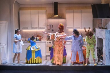 Актеры слева направо: Антон Куренков в роли Дядюшки Утюга, Ольга Мелкумова в роли Тетушки Метлы, Лидия Светозарова в роли Золушки, Юлия Горелова в роли Кочерги и Антон Фадеев в роли Отважного Чайника во время премьеры спектакля «Золушка» в Московском музыкальном театре «Геликон-опера».