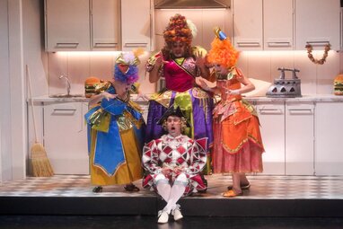 Актеры слева направо: Антон Куренков в роли Дядюшки Утюга, Ольга Мелкумова в роли Тетушки Метлы, Антон Фадеев в роли Отважного Чайника и Юлия Горелова в роли Кочерги во время премьеры спектакля «Золушка» в Московском музыкальном театре «Геликон-опера».