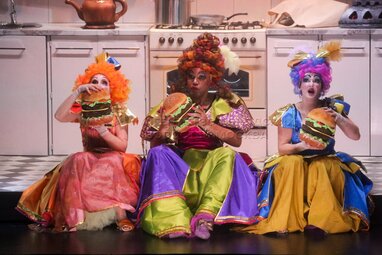 Актеры слева направо: Алексей Дедов в роли Мачехи, Ольга Давыдова в роли Жавотты и Ольга Спицына в роли Гортензии во время премьеры спектакля «Золушка» в Московском музыкальном театре «Геликон-опера».