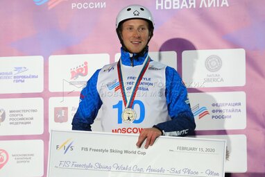 Cпортсмен из Белоруссии Павел Дик, получивший бронзовую медаль во время награждения на этапе Кубка мира FIS по фристайлу на территории спортивного комплекса «Воробьевы горы».