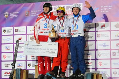 Спортсмен из Швейцарии Ноэ Рот, получивший серебряную медаль, спортсмен из России Павел Кротов, получивший золотую медаль, спортсмен из Белоруссии Павел Дик, получивший бронзовую медаль (слева направо) во время награждения на этапе Кубка мира FIS по фристайлу на территории спортивного комплекса «Воробьевы горы».