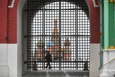 Решетка Воскресенских ворот, закрытая в связи с пандемией COVID-19, вид на храм Василия Блаженного.