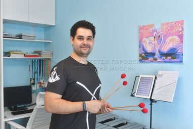 Артист ударных инструментов (вибрафон) оркестра под управлением Павла Когана Дмитрий Машко репетирует в условиях самоизоляции из-за пандемии коронавируса.