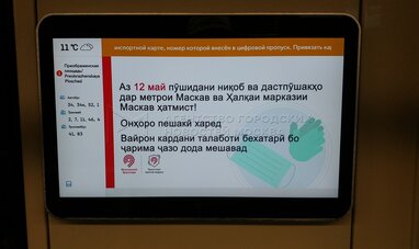 Размещенное в вагонах московского метро объявление на разных языках об обязательном ношении защитных масок и перчаток.