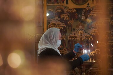 Прихожане в храме Христа Спасителя, открывшемся после смягчения ограничений, введенных из-за распространения коронавирусной инфекции.
