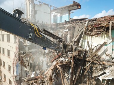 Вид с квадрокоптера на снос расселенного жилого дома на Русаковской улице по программе реновации столичного жилфонда.