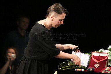 Дочь актера В.Проскурина актриса Александра Бледная во время прощания с заслуженным артистом РСФСР Виктором Проскуриным в театральном училище имени Щукина.