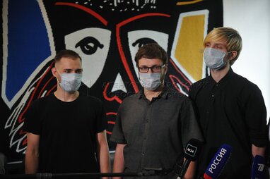 Добровольцы Сергей Семенихин, Дмитрий Толкачев, Георгий Смирнов (справа налево) во время выписки из Сеченовского университета после вакцинации против коронавируса.