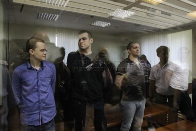 Фигуранты дела «Нового величия» Вячеслав Крюков, Руслан Костыленков, Петр Карамзин и Дмитрий Полетаев (слева направо), обвиняемые в экстремизме, во время оглашения приговора в Люблинском суде города Москвы.