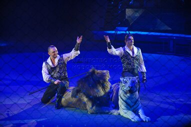 Дрессировщики Аскольд и Эдгар Запашные во время циркового спектакля «И100РИЯ» в Большом Московском государственном цирке на пр. Вернадского.