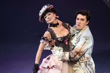 Актер Владислав Демченко в роли Ахилла де Розальба и актриса Лидия Вележева в роли баронессы де Шампаньи в спектакле «Соломенная шляпка» на Новой сцене Вахтанговского театра.