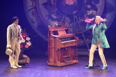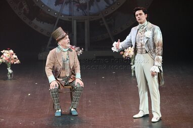 Актеры Олег Форостенко в роли Везине и Леонид Бичевин в роли Фадинара и в спектакле «Соломенная шляпка» на Новой сцене Вахтанговского театра.