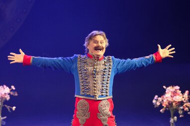 Актер Леонид Бичевин в роли Фадинара в спектакле «Соломенная шляпка» на Новой сцене Вахтанговского театра.