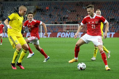 Игроки слева направо Егор Сорокин (Россия), Робин Квайсон (Швеция) во время контрольного матча по футболу между национальными сборными России и Швеции на стадионе «ВЭБ Арена».