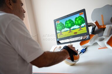 Занятия на тренажерах с биологической обратной связью для верхних конечностей для пациентов после перенесенного ишемического инсульта в Федеральном центре мозга и нейротехнологий ФМБА России.
