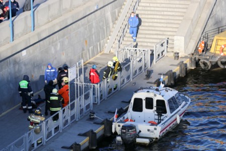 Работа экстренных служб на месте падения автомобиля в Москву-реку в районе Пречистенской набережной