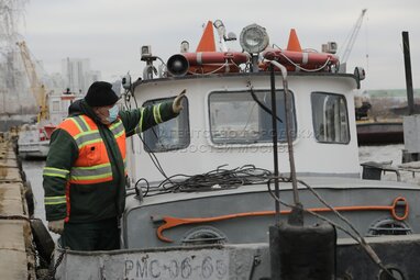 Начальник флота ГУП «Мосводосток» Вячеслав Шуткин во время транспортировки судов в рамках закрытия технической навигации 2020 года флота Мосводостока на Москве-реке.