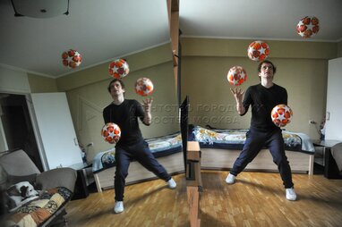Жонглер и дрессировщик собак Михаил Ермаков репетирует в условиях самоизоляции из-за пандемии коронавируса.
