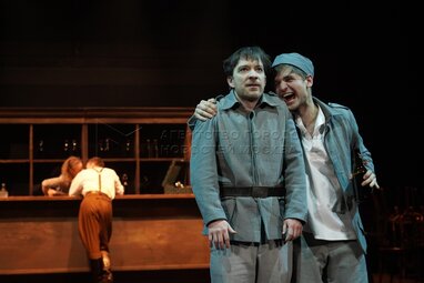 Актеры Павел Юдин в роли тамбурмажора (слева) и Максим Севриновский в роли Войцека во время показа премьерного спектакля «Войцек» по пьесе Георга Бюхнера на Новой сцене Театра имени Вахтангова.