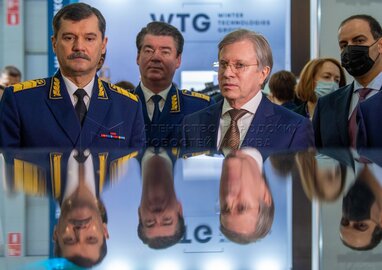 Первый заместитель министра транспорта РФ Александр Нерадько, заместитель руководителя Федерального агентства воздушного транспорта (Росавиация) Олег Сторчевой и министр транспорта РФ Виталий Савельев (слева направо) на восьмой национальной выставке и форуме инфраструктуры гражданской авиации NAIS 2021 в «Крокус Экспо».