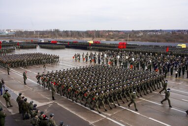 Совместная тренировка парадных расчетов, экипажей военной техники и авиационных экипажей, принимающих участие в военном параде на Красной площади 9 мая 2021 года, на полигоне в Алабино.