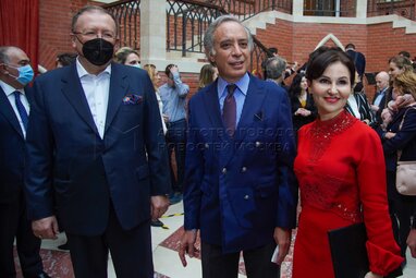 Директор музея-заповедника «Царицыно» Елизавета Фокина и председатель наблюдательного совета группы компаний Bosco di Ciliegi Михаил Куснирович и чрезвычайный и полномочный посол Италии в России Паскуале Терраччано (слева направо) во время торжественного открытия выставки «Под маской Венеции» в рамках Открытого фестиваля искусств «Черешневый лес».