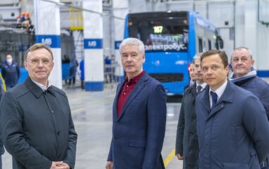 Генеральный директор ПАО «Камаз» Сергей Когогин, мэр Москвы Сергей Собянин и заместитель мэра Москвы по вопросам транспорта Максим Ликсутов (слева направо) во время посещения центра по производству электробусов на территории Сокольнического вагоноремонтно-строительного завода (СВАРЗ) - филиала ГУП «Мосгортранс». Фото: Владимир Новиков, пресс-служба мэра и правительства столицы.