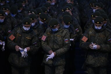 Пешие расчеты перед ночной репетицией Парада Победы в Москве.