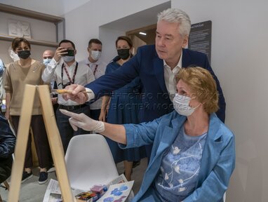 Мэр Москвы Сергей Собянин посетил городской клуб нового формата для людей старшего поколения «Мой социальный центр» в Ломоносовском районе, где также поздравил социальных работников с профессиональным праздником. Фото: Владимир Новиков, пресс-служба мэра и правительства столицы.