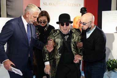 Модельер Вячеслав Зайцев (в центре) на презентации своей книги «Провидение» и открытии экспозиции художественных работ в музее «Собрание».