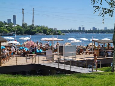 Отдых горожан на новой пляжной зоне с бассейнами у Северного речного вокзала