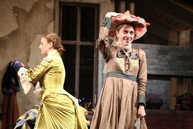 Актриса Сафия Яруллина в роли Полины (слева) и Зинаида Дианова в роли Юлиньки во время показа премьерного спектакля «Доходное место» по пьесе Александра Островского, в постановке Дмитрия Астрахана в Московском государственном театре «Ленком Марка Захарова».