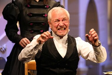 Актер Дмитрий Астрахан в роли Акима Акимыча Юсова во время показа премьерного спектакля «Доходное место» по пьесе Александра Островского, в постановке Дмитрия Астрахана в Московском государственном театре «Ленком Марка Захарова».