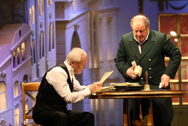 Актеры Евгений Герасимов в роли Аристарха Владимирыча Вышневского (слева) и Дмитрий Астрахан в роли Акима Акимыча Юсова во время показа премьерного спектакля «Доходное место» по пьесе Александра Островского, в постановке Дмитрия Астрахана в Московском государственном театре «Ленком Марка Захарова».