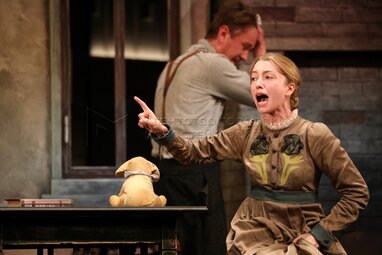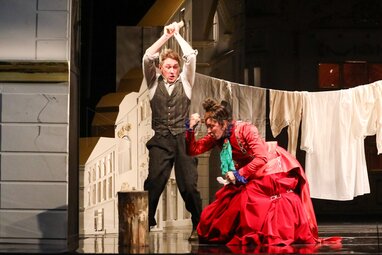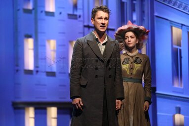 Актеры Антон Шагин в роли Василия Николаича Жадова и Олеся Железняк в роли Фелисаты Герасимовны Кукушкиной во время показа премьерного спектакля «Доходное место» по пьесе Александра Островского, в постановке Дмитрия Астрахана в Московском государственном театре «Ленком Марка Захарова».