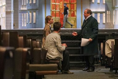 Актеры Олеся Железняк (по центру на втором плане) и Дмитрий Астрахан (справа на втором плане) перед показом премьерного спектакля «Доходное место» по пьесе Александра Островского, в постановке Дмитрия Астрахана в Московском государственном театре «Ленком Марка Захарова».