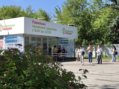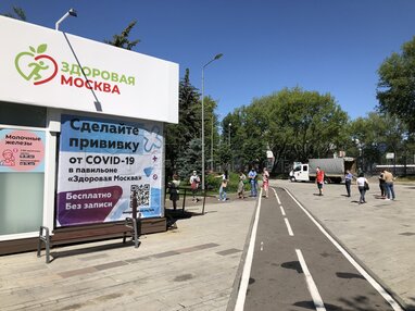 Очередь на вакцинацию от коронавируса в павильон «Здоровая Москва» в Фестивальном парке