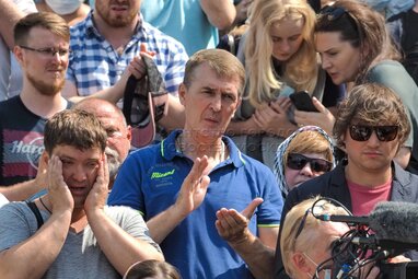 Основатель и глава лейбла «Отделение ВЫХОД» Олег Коврига во время церемонии прощания с рок-музыкантом, актером и поэтом Петром Мамоновым в Донском монастыре.
