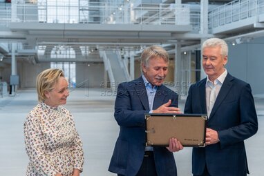 Генеральный директор фонда V-A-C Тереза Мавика, председатель правления ПАО «Новатэк» Леонид Михельсон и мэр столицы Сергей Собянин (слева направо) осмотрел завершение работ по строительству, реконструкции, восстановлению и реставрации уникального культурного пространства Дома культуры «ГЭС-2» на Болотной набережной. Фото: Максим Мишин, пресс-служба мэра и правительства Москвы.