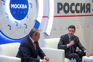 Секретарь Московского городского регионального отделения «Единой России» Петр Толстой (слева) и представитель Мосгордумы в Общественном штабе наблюдения за выборами в Москве Александр Козлов во время брифинга по предварительным итогам голосования на выборах депутатов Государственной думы.