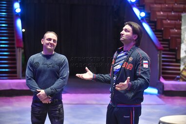 Художественный руководитель Большого Московского цирка, дрессировщик Аскольд Запашный (слева) и генеральный директор Большого Московского цирка, дрессировщик Эдгард Запашный перед взвешиванием слонихи Николь и ее подарка - гигантской тыквы.