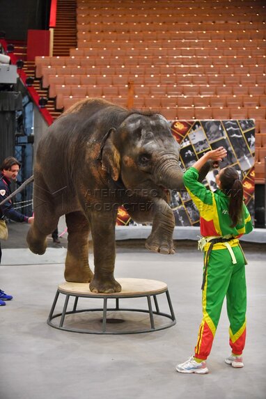 Генеральный директор Большого Московского цирка, дрессировщик Эдгард Запашный и дрессировщица Ярославна Демешко во время взвешивания слонихи Николь и ее подарка - гигантской тыквы.
