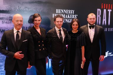 Актер, режиссер, продюсер Федор Бондарчук и его супруга, актриса Паулина Андреева, актер Константин Крюков и его супруга Алина Алексеева, актер Сергей Бондарчук (слева направо) на премьере фильма «Бондарчук. Battle» в кинотеатре «Художественный».