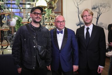 Режиссер Кирилл Серебренников, генеральный директор информационного агентства ТАСС Сергей Михайлов и продюсер Илья Стюарт (слева направо) на премьере фильма «Бондарчук. Battle» в кинотеатре «Художественный».