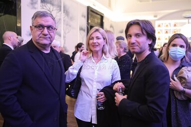 Продюсеры Александр Акопов (слева) и Петр Ануров с супругой Натальей на премьере фильма «Бондарчук. Battle» в кинотеатре «Художественный».