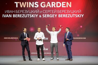 Обладатели двух звезд Michelin шеф-повара ресторана Twins Garden Иван и Сергей Березуцкие (на первом плане) во время церемонии вручения звезд Michelin ресторанам и шеф-поварам Москвы.