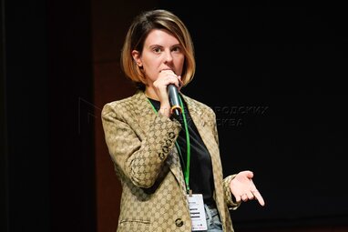 Модератор - директор по маркетингу и коммуникациям КБ «Стрелка» Лилия Изгалина во время дискуссии на тему «Инфраструктура» в рамках первого кикшеринг-съезда «Всероссийской конференции кикшеринг-отрасли» на территории «Цифрового делового пространства».