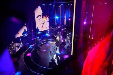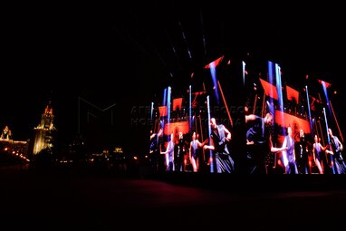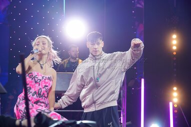 Певцы Клава Кока и Niletto на выступлении городского медиафестиваля «Твоя Москва», который организует телеканал «Москва 24» с 22 по 24 октября 2021 года, на Университетской площади перед главным зданием МГУ имени Ломоносова.